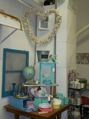 Changed out our first display {which held Valentines stuff xoxo} to lots of pretty aqua, turquoise and a splash of pink! You know how I love me some PINK and TURQUOISE! There are some darling retro cannister sets and sweet pink and turquoise Pyrex! A girl can never have too much vintage Pyrex ~ wouldn't you agree?